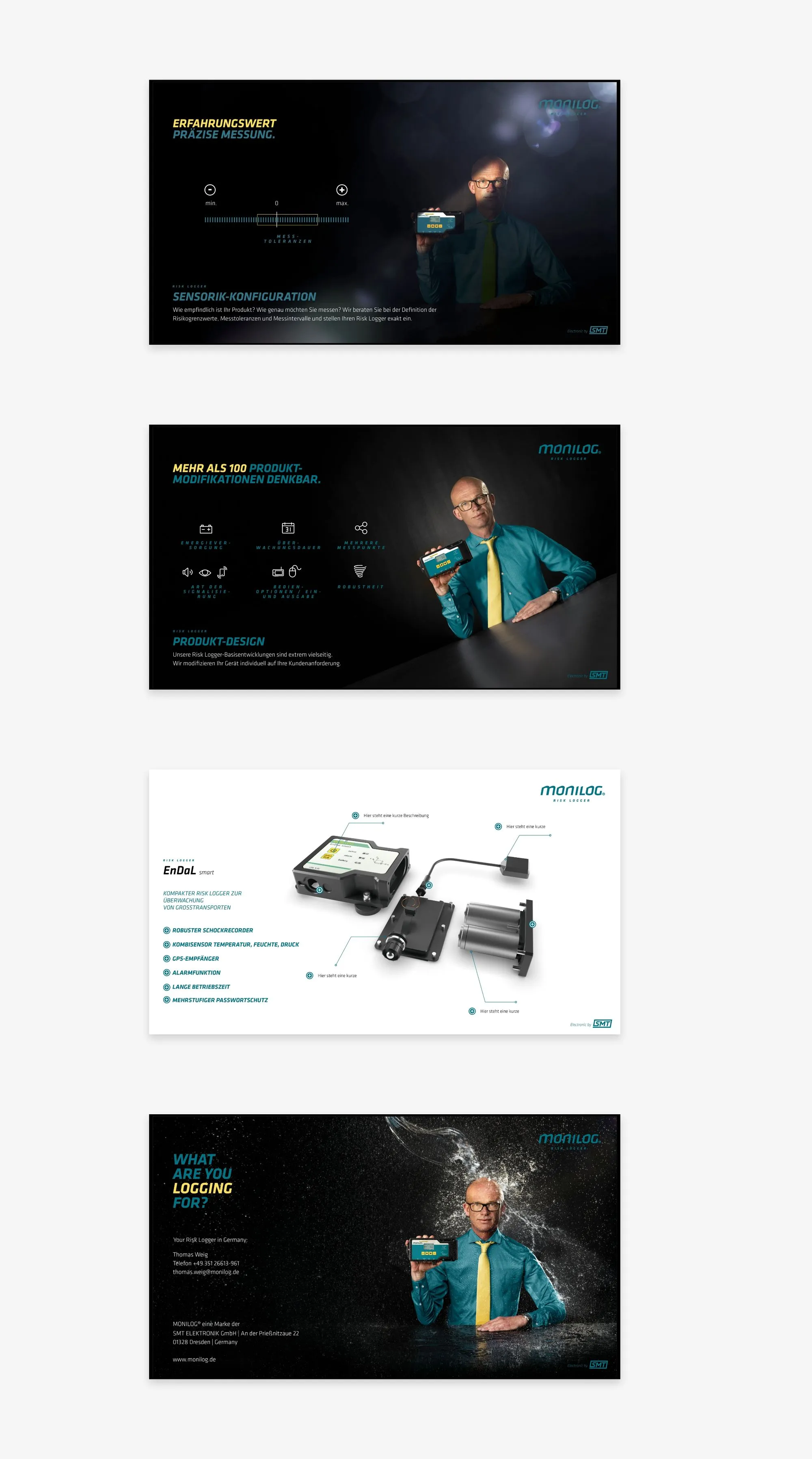 MONILOG® Produkte messen, signalisieren und dokumentieren die äußeren Einflüsse, die ein ernsthaftes Risiko für den Transport, die Lagerung oder den Betrieb sensibler Güter darstellen. Konsequent geht der Hersteller den Schritt in eine eigene Produktkategorie – vom Datenlogger zum Risklogger. Die einzigartige Bildwelt ermöglicht eine schlagkräftige Vertriebsräsentation des vielschichtigen Produktnutzens.