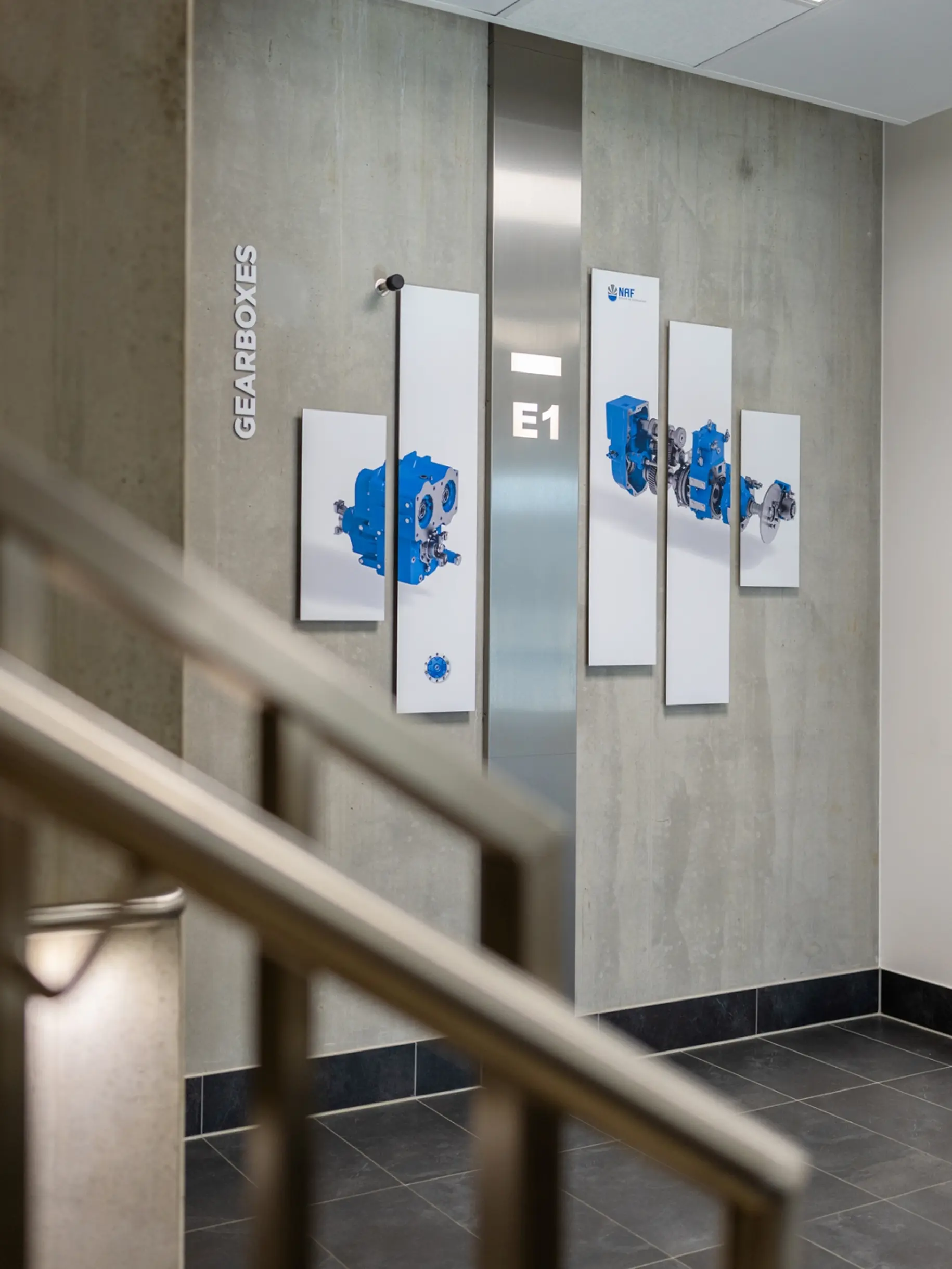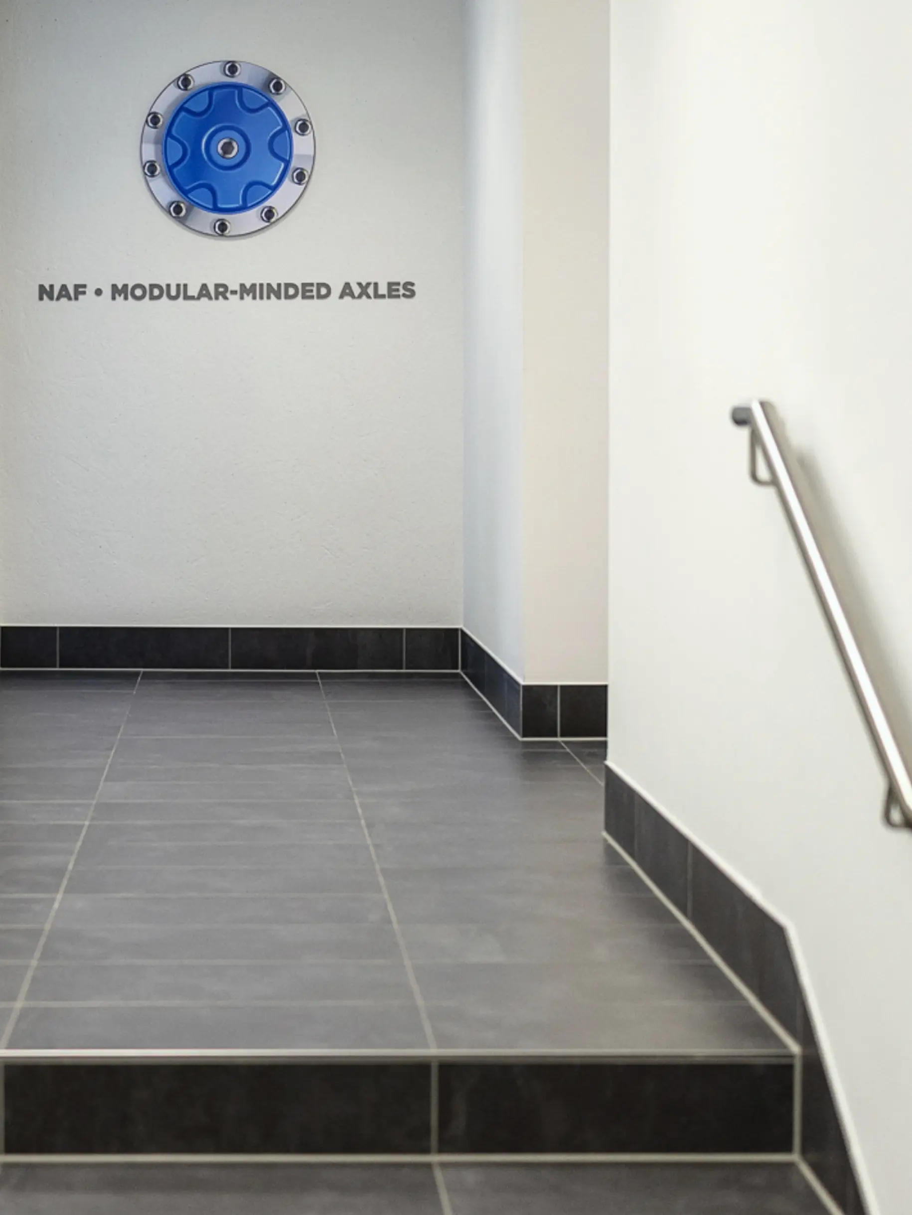 Die Positionierung „Modular Minded Axles“ wurde in die Raumgestaltung des neuen Hauptgebäudes übertragen. Vom Treppenhaus über die Begegnungsbereiche rund um die Aufzüge bis hin zu Besprechungsräumen und dem offenen Teambereich wurde die Marke in die Architektur integriert. Das Ergebnis: Arbeitsumgebungen, die Energie freisetzen, Teams verbinden und die Marke im täglichen Miteinander lebendig halten – sichtbar, spürbar, jeden Tag.