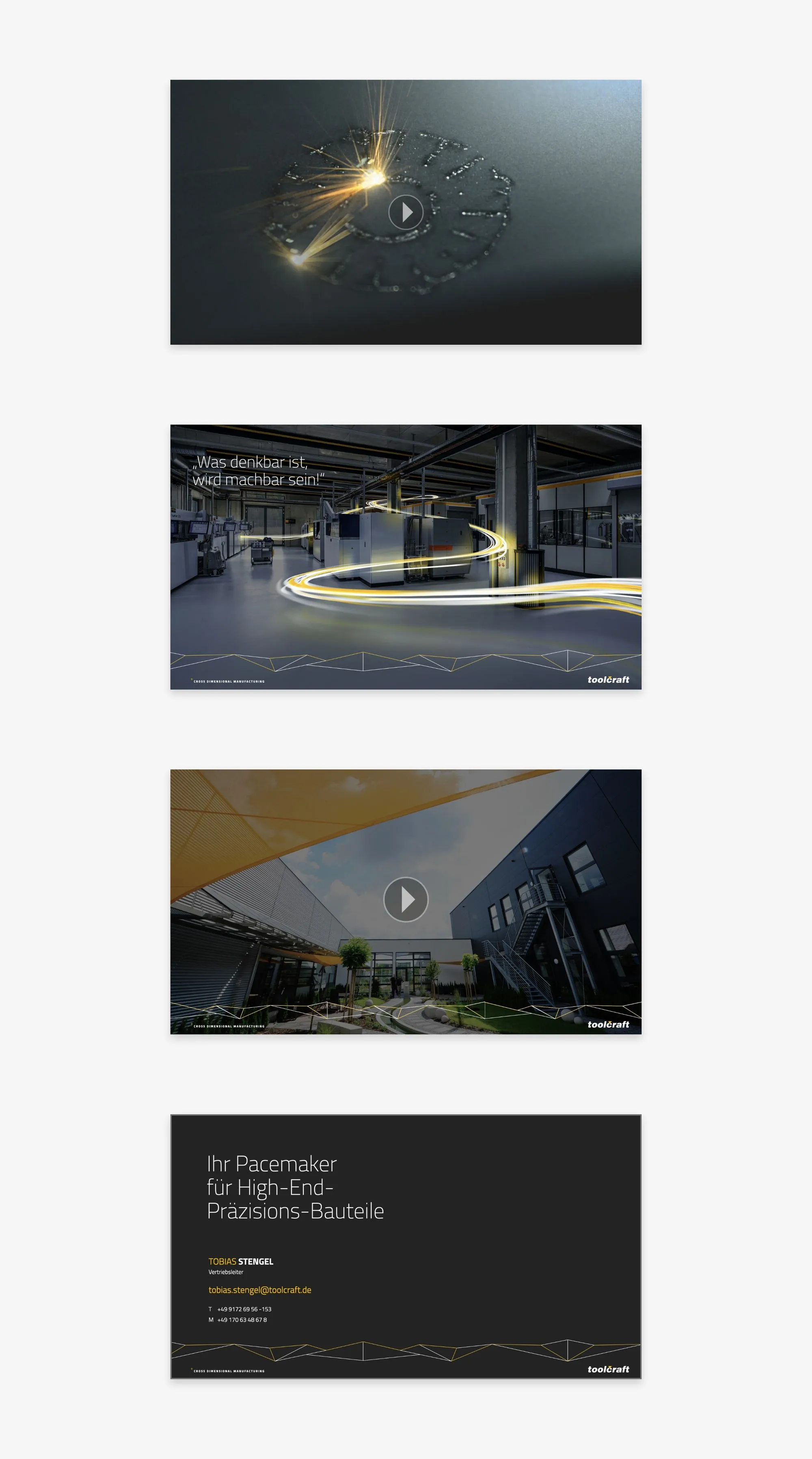 toolcraft setzt sich immer an die Spitze – nicht, um selbst im Mittelpunkt zu stehen, sondern um Kunden zur Bestmarke in ihrer Branche zu ziehen. Dafür wird die Breite der Fertigungstechnologien mit der Tiefe des Fertigungsprozesses zu einem eigenen Beratungs- und Fertigungsstandard vernetzt: Cross Dimensional Manufacturing. In sich schlüssiges Storytelling und Design bringen die komplexe Leistung vertriebsstark auf den Punkt. Und: Durch Synchronisierung mit der ARBEITGEBERMARKE geht toolcraft auch beim RECRUITING ganz nach vorne.