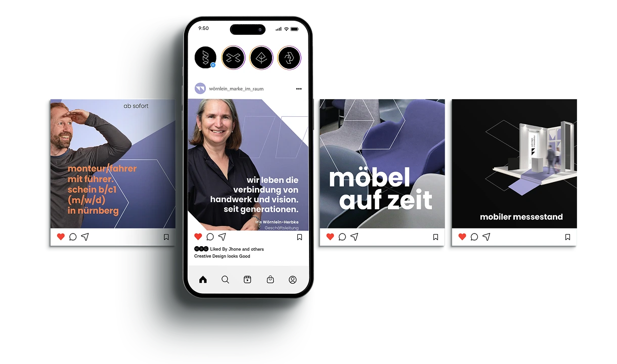 Auf Basis dieser strategischen Entscheidung wurde eine Dachmarke eingezogen und eine klare Positionierung mit neuer Visualität und dem Claim “marke im raum” entwickelt. Die neue Kommunikation übersetzt den Wandel in Struktur, Sprache und Bildwelt und macht Kompetenzen, Haltung und Projekte sichtbar. So wird Wörnlein nicht mehr nur als Dienstleister, sondern als ganzheitlicher Partner für Markeninszenierung wahrgenommen – markenbildend, echt und nachhaltig. Auch als Arbeitgeber.